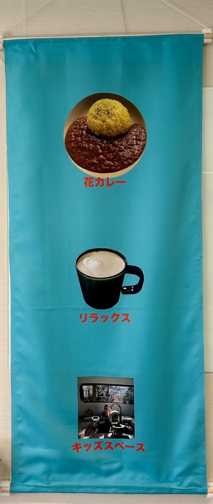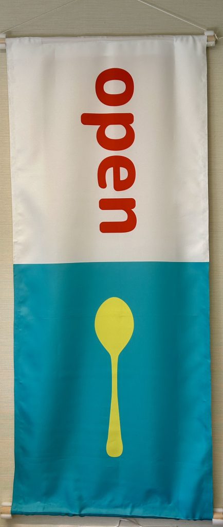 OPEN時には、画像の垂れ幕を玄関に吊るしております。